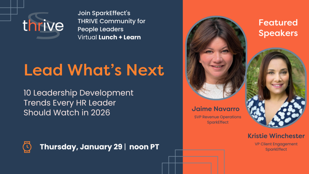 Join SparkEffect’s virtual Thrive HR Community on Thursday, January 29th for an interactive Lunch & Learn featuring Jaime Navarro and Kristie Winchester.