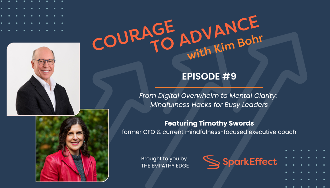 In this episode of Courage to Advance, host Kim Bohr sits down with Timothy Swords, a mindfulness-focused executive coach, to explore how leaders can cut through digital noise and stress to regain mental clarity and make confident decisions. Timothy shares his unique journey from corporate consulting to mindfulness coaching, revealing practical techniques that have transformed executives from being the “scary person in the room” to creating harmonious relationships with their teams.